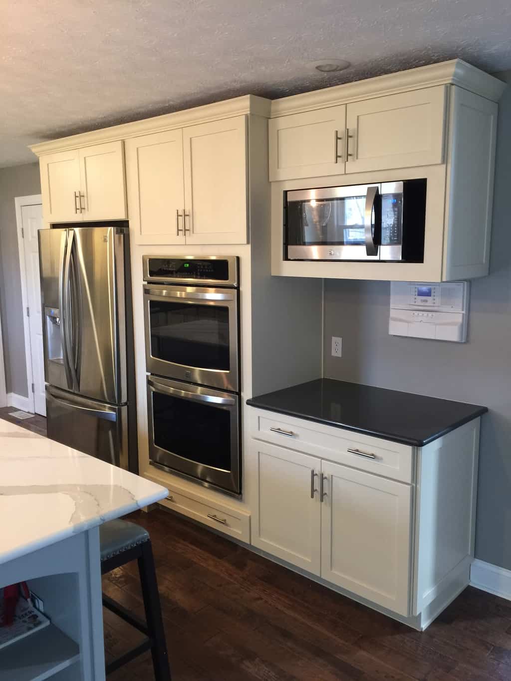 In this case, by eliminating their existing peninsula, which served no real purpose, and relocating the range and refrigerator to different walls, we were able to configure a more efficient working triangle.