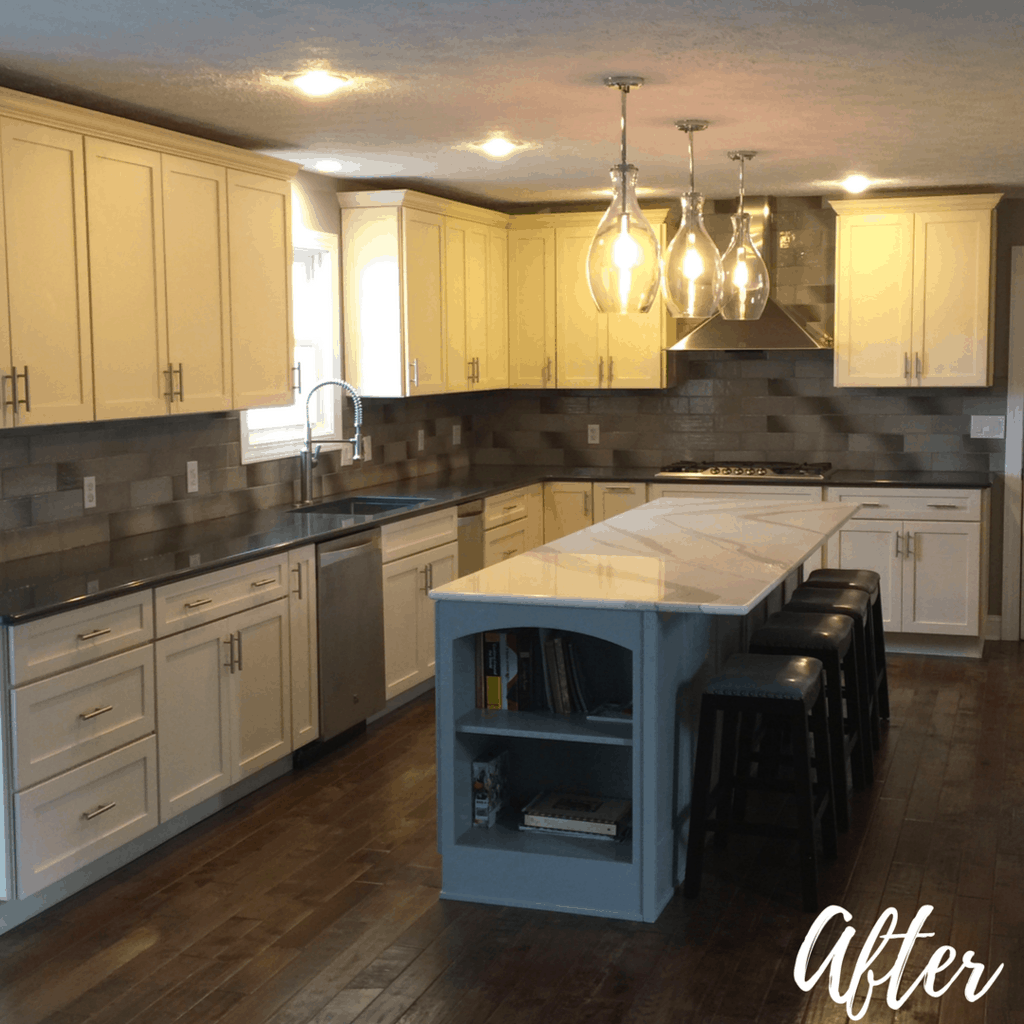 The new island was a sight to behold. Its custom Paris Grey by Annie Sloan Chalk Paint finish was hand applied by our YDI team. An open-shelf bookcase can be seen from the living and dining spaces and creates interest as well as a place for all of Mrs. Kauffman’s cookbooks.